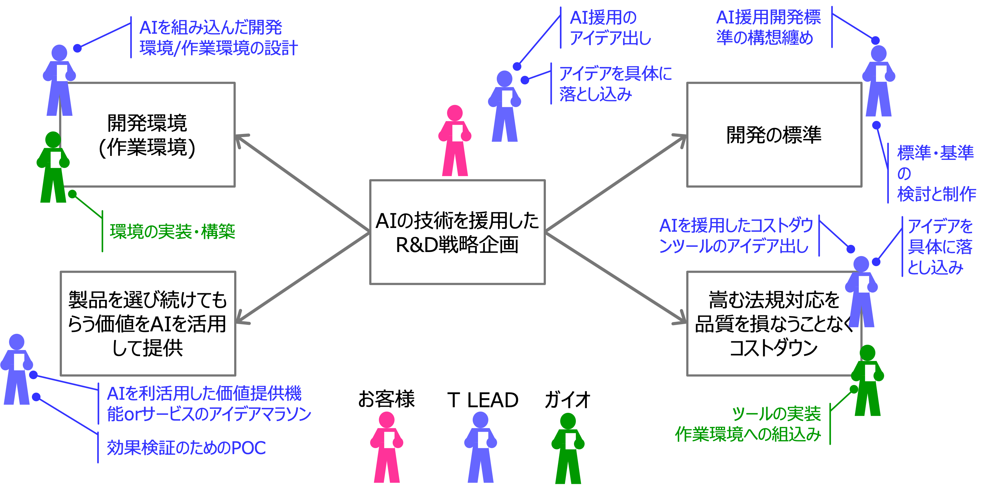 ・下図に示す通り、お客様の意思を汲み取り、AI技術を各所で利活用できるよう、アイデア出し→提案→構想固め→設計→実装→運用立ち上げ、の各シーンで貢献。